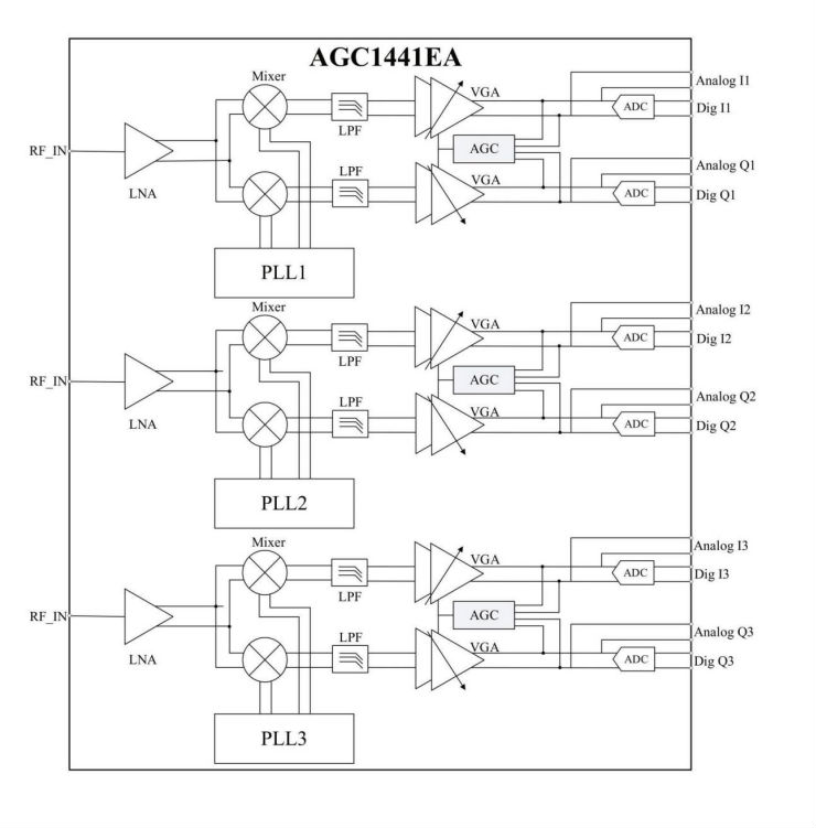 AGC1441EA GNSS Receiver IC是一款高度集成的多模多頻段三通道射頻接收機,支持三個通道同時獨立工作,完全滿足 1.1GHz~1.7GHz頻段的衛(wèi)星信號。片上集成三個通道接收機,接收機均包括低噪聲放大器(LNA)及正交混頻器(MIXER)、低通濾波器(LPF)、可變增益放大器(AGC)、模數(shù)轉(zhuǎn)換器(ADC)、全集成小數(shù)分頻鎖相環(huán)和時鐘鎖相環(huán)等電路,僅需很少的外圍元器件即可工作,支持模擬和數(shù)字同時輸出。