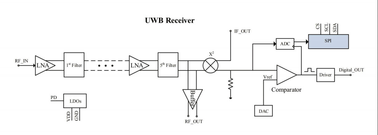 AGC3401EA 室內(nèi)定位射頻前端芯片完成3.8G-4.5GHz寬帶脈沖調(diào)制信號(hào)的放大、濾波、包絡(luò)檢波、檢波后的脈沖基帶信號(hào)放大驅(qū)動(dòng)、基帶脈沖比較器、高速基帶脈沖 ADC、數(shù)字脈沖信號(hào)輸出和LDO。芯片集成 SPI接口,通過(guò)該接口實(shí)現(xiàn)芯片的工作模式配置及性能指標(biāo)優(yōu)化,采用0.18um RF CMOS 工藝實(shí)現(xiàn)高度集成的UWB 接收芯片。