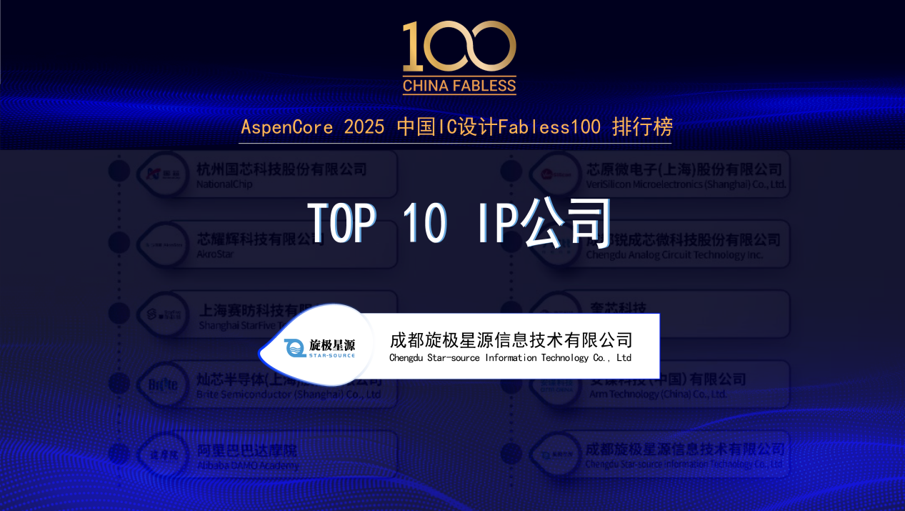 2025年3月27日,全球電子產(chǎn)業(yè)權(quán)威媒體AspenCore發(fā)布了《2025中國IC設(shè)計Fabless100排行榜》,旋極星源憑借技術(shù)突破、生態(tài)協(xié)同與市場表現(xiàn)三大核心優(yōu)勢,榮登“Top 10 IP公司”榜單。
