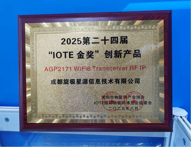 8月27日,在IOTE深圳物聯(lián)網(wǎng)展同期舉行的IOTE金獎2025創(chuàng)新產(chǎn)品評選頒獎典禮上,旋極星源憑借又一款創(chuàng)新產(chǎn)品—AGP2171 WiFi6 Transceiver RF IP摘下IOTE金獎。這已是旋極星源連續(xù)多年獲得這一物聯(lián)網(wǎng)行業(yè)的重要獎項(xiàng),充分體現(xiàn)了其在無線連接領(lǐng)域持續(xù)的技術(shù)創(chuàng)新能力和卓越的市場表現(xiàn)力。