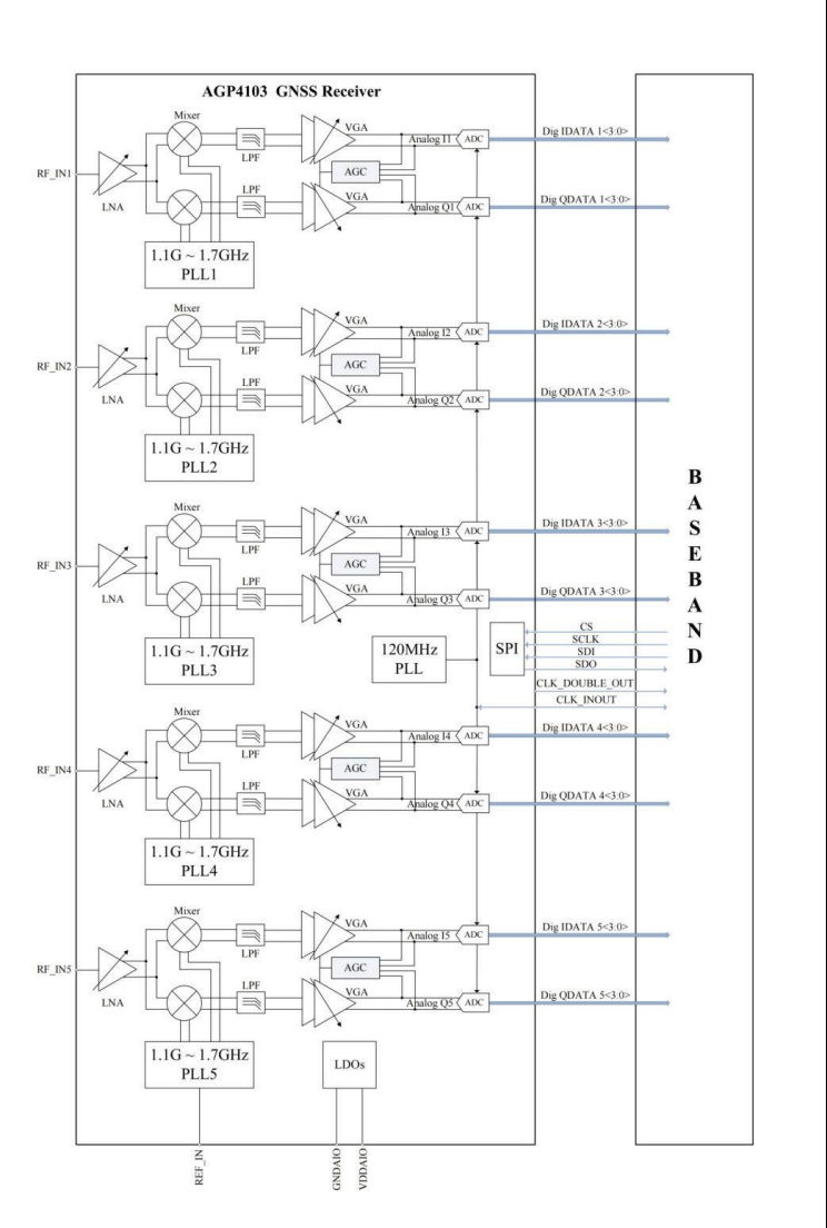 AGP4103 GNSS Receiver RF IP 采用 22nm CMOS 工藝,是一款高度集成的多模多頻段五通道寬帶 GNSS 射頻接收機(jī) IP,完全滿(mǎn)足1.1GHz~1.7GHz頻段的衛(wèi)星導(dǎo)航信號(hào)接收。IP集成獨(dú)立五通道接收機(jī),每通道包括低噪聲放大器(LNA)及正交混頻器(MIXER)、低通濾波器(LPF)、自動(dòng)增益控制(AGC)、模數(shù)轉(zhuǎn)換器(ADC)、全集成小數(shù)分頻鎖相環(huán)和時(shí)鐘鎖相環(huán)等電路支持模擬和數(shù)字中頻信號(hào)輸出。GNSS 接收機(jī)可配置為高線性模式和低功耗模式,以滿(mǎn)足多種應(yīng)用需求。